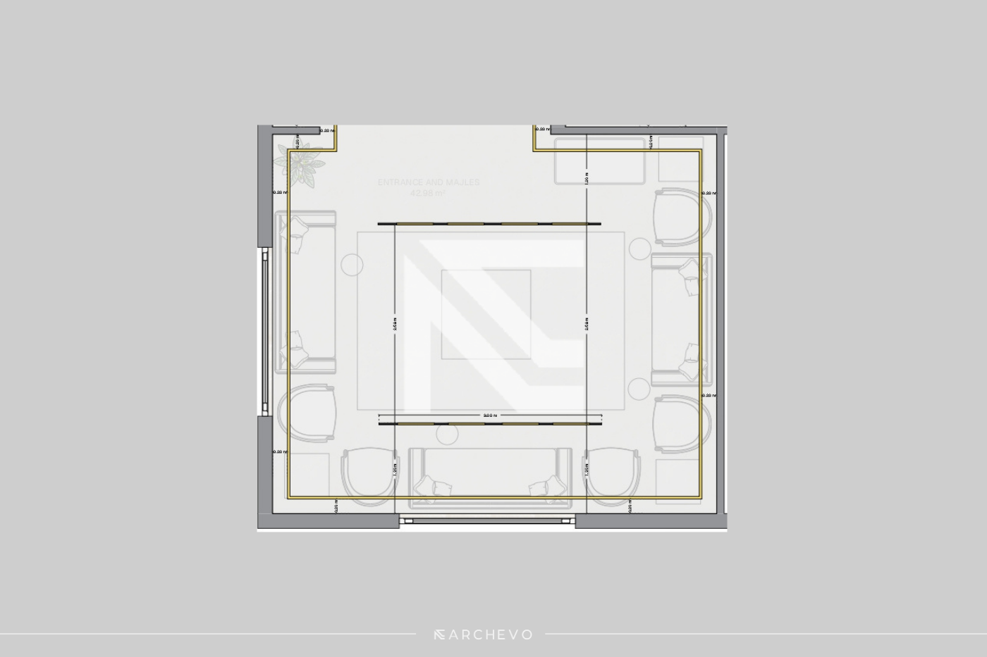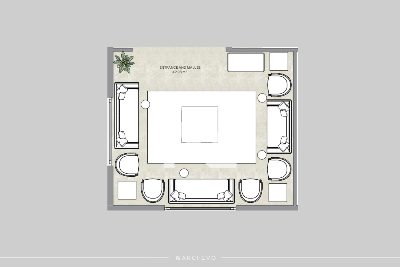 هذا المخطط هو أساس كل شيء . يحدد لك وين بيكون الكنب، السرير، الطاولات، وحتى مساحات الحركة .